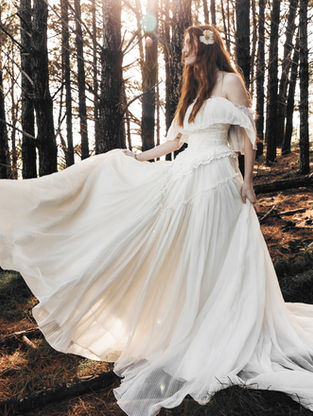 The embroidered ruffle waistline flows into a tiered skirt that moves beautifully—romantic, but not overly precious. And with the option to wear it with or without the off-the-shoulder ruffle, this bohemian lace wedding dress can shift depending on how you want to feel—soft and romantic or a little more clean and streamlined.