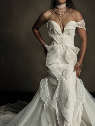Ethereal and otherworldly, the Asteria Gown draws inspiration from fantasy, with intricate corded embroidery that sweeps across the body like angelic wings. The structured bodice seamlessly transitions into a figure-hugging silhouette, which flows into a breathtaking, dramatic train of billowing organza.
