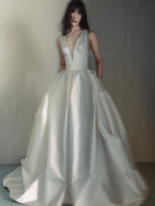 Knot by Wink Atelier is a modern statement gown defined by sculptural satin and effortless structure. The design features a plunging and a beautifully tailored bodice that creates a clean, architectural silhouette. The voluminous satin skirt unfolds into dramatic fullness with soft pleating and hidden pockets, balancing minimalism with striking presence. Crafted in luminous silk satin, Knot captures Wink Atelier’s signature blend of modern couture and refined simplicity, perfect for the bride drawn to bold yet timeless design.