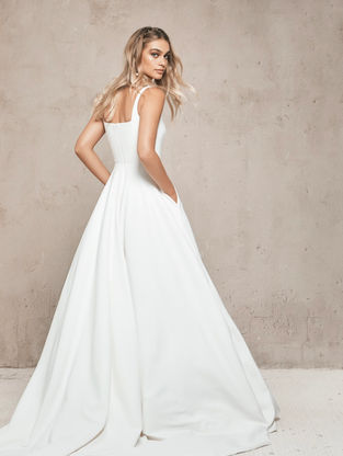 A modern classic, this gown features a contemporary square neckline and matching backline with a reinforced bodice for structure and support. The full crepe ballgown skirt adds drama and elegance, complete with hidden pockets for a touch of practicality.