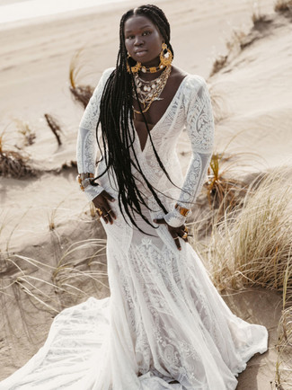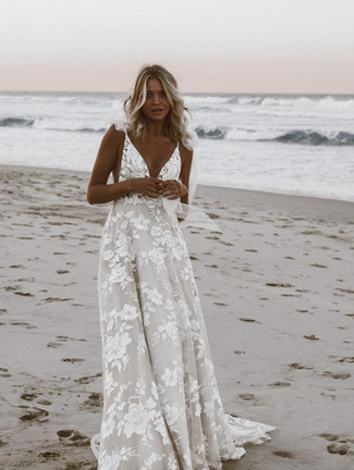 Becky wore the Jackson gown by Rue de Seine and it was perfect for her Riviera Maya venue with its bold lace pattern and fun front slit but here are a couple other looks we think would make great choices for beachy elopements.